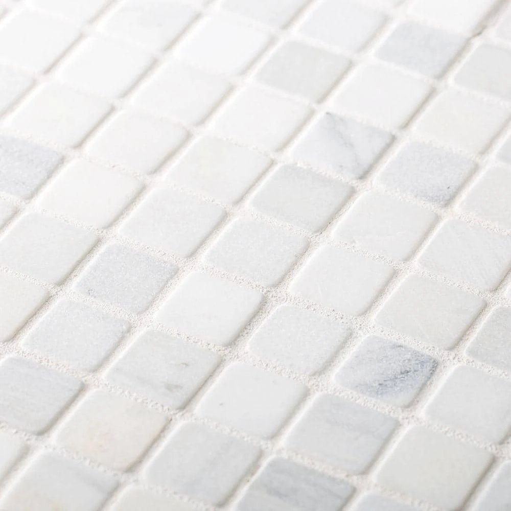 Carrara White 11-3/4 in. x 11-3/4 in. Marble Mosaic Tile adds a touch of luxe to your bathroom or kitchen. This natural stone mosaic features mini white carrara marble squares in a honed finish and natural gray veining adding appeal to a classic neutral. Combine with other mosaics and field tiles to create impressive installations. For best installation results, use white polymer-modified thinset.