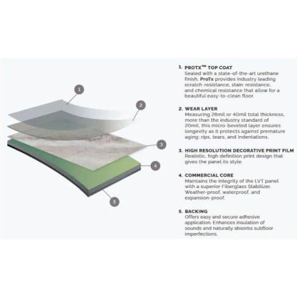 - Thanks to the uniquely formulated ProTX protective layer, our LVT is impenetrable by liquids, scratch- resistant, and simple to clean; no more fear of spills that stain or ruin floors