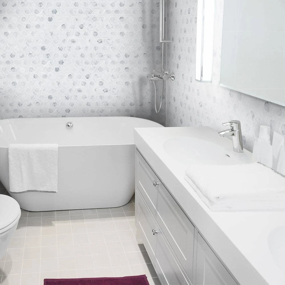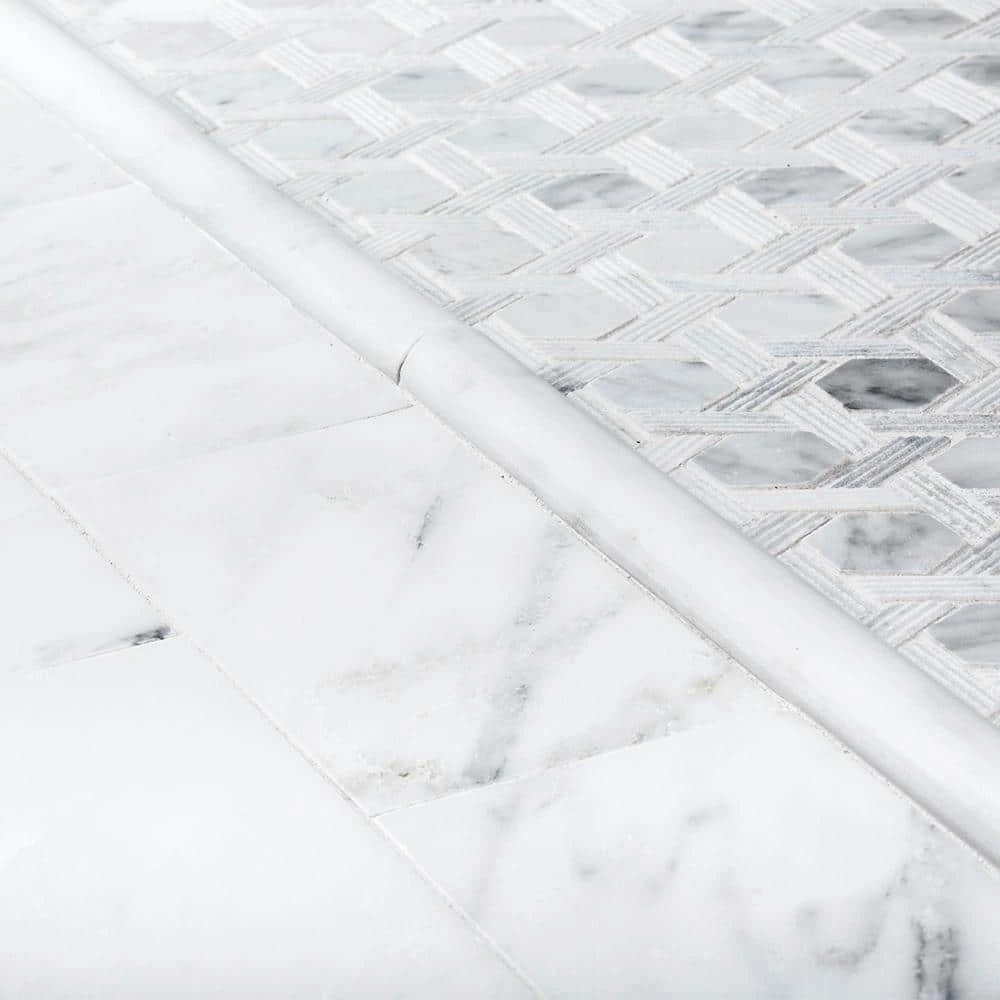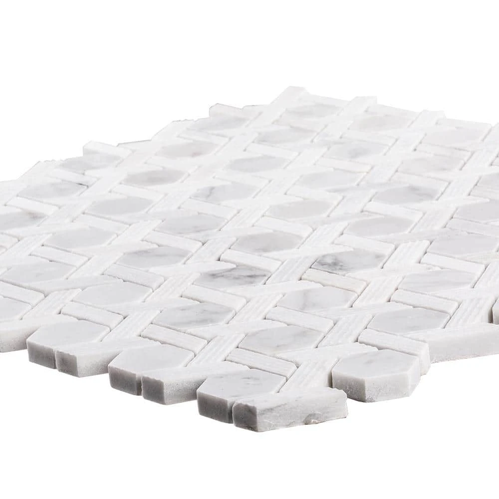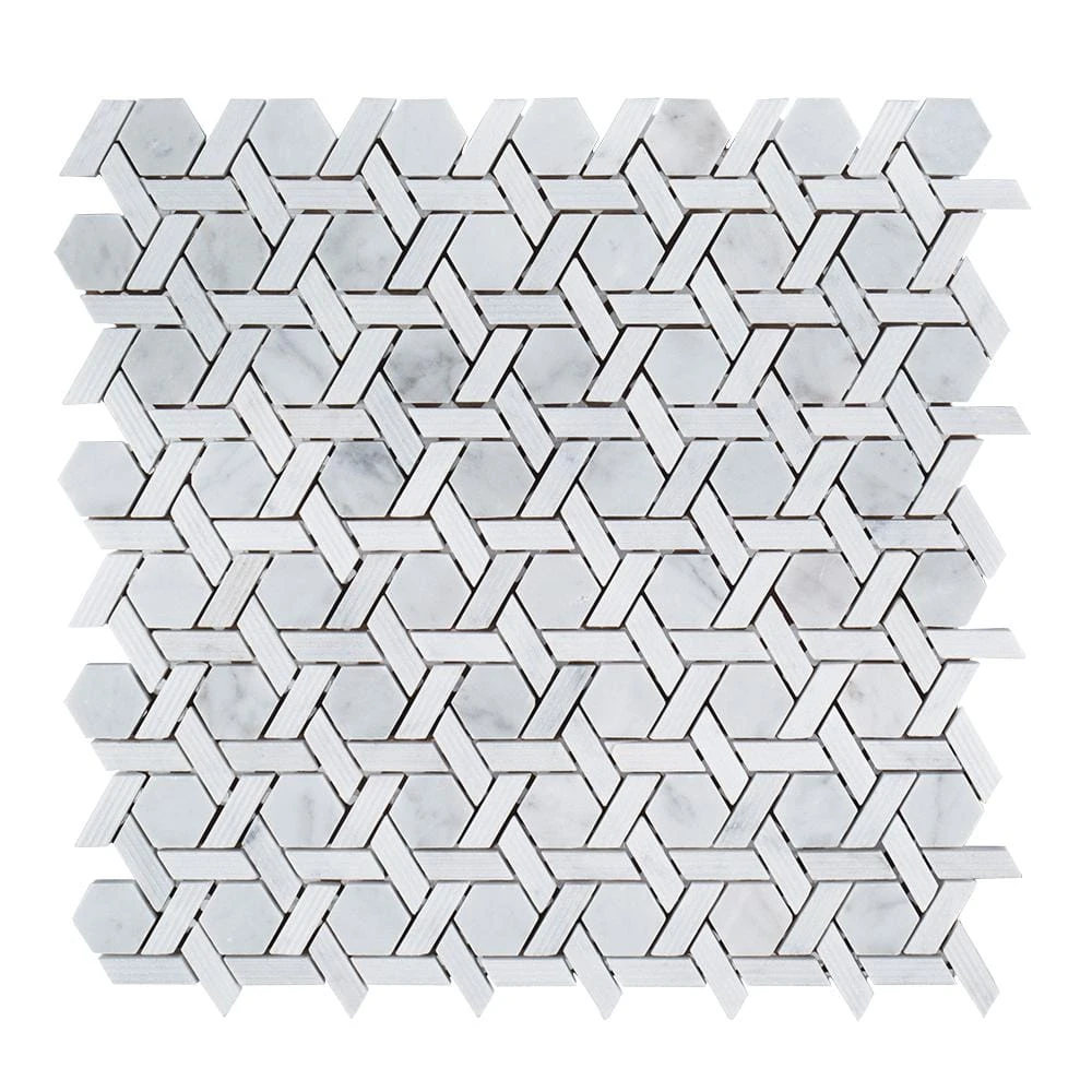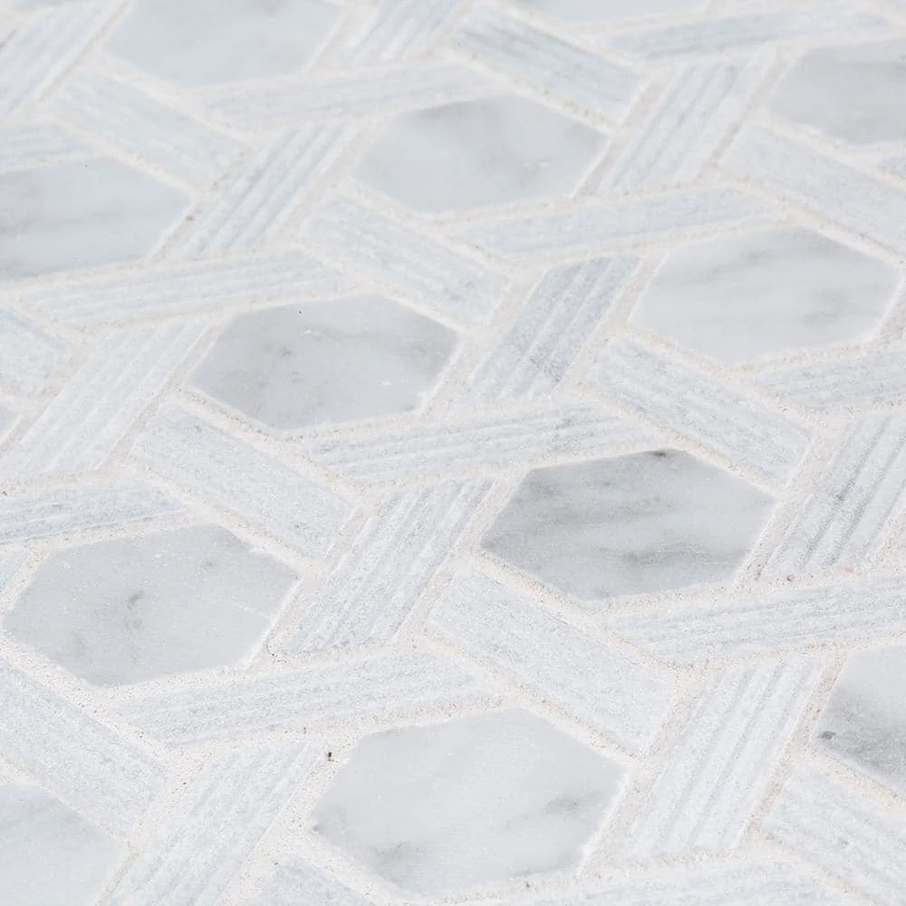 Update the look of your space with the Primrose Chapel 11-7/8 in. x 11-3/4 in. Marble Mosaic. This mosaic features a basketweave pattern with hexagon pieces for a unique look. The mosaic’s white carrara marble stone has gray veining with textured and honed pieces. Perfect for an array of styles, from traditional to modern. Combine with other mosaics and field tiles to create impressive installations. For best installation results, use white polymer-modified thinset.